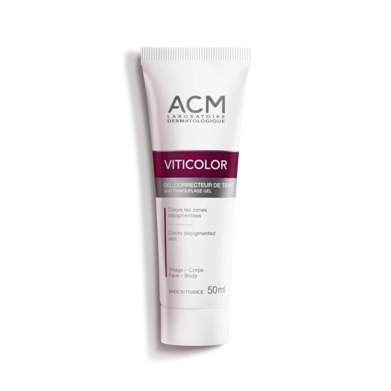 ACM Viticolor Gel Correcteur de Teint 50 ml est un gel correcteur teint durable qui peut s’utiliser conjointement aux traitements habituels du vitiligo en particulier la photothérapie, pour colorer les zones dépigmentées du visage et du corps.